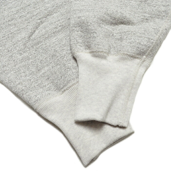 1950年代のアメリカのビンテージパーカーをベースにしています。スウェットの中でも通常16.5ozはかなり厚手に相当しますが、本製品はそれよりも厚い20.5ozのファブリックを使用。ドライタッチで長年の着用や洗濯にも強く、堅さやハリが残るので、形崩れしにくいのが特徴です。ニット生地を編み立てる旧式の吊り編み機は1960年代頃まで使われていました。空気と一緒に編み込むような柔らかな風合ながら、一日に数メートルしか編む事が出来ません。大量生産期には生産効率の低さ故、革新機へと転換されました。本製品は、革新機でも吊り編み機で編んだようなビンテージスウェット特有のヨコ段が走る表情に編まれています。