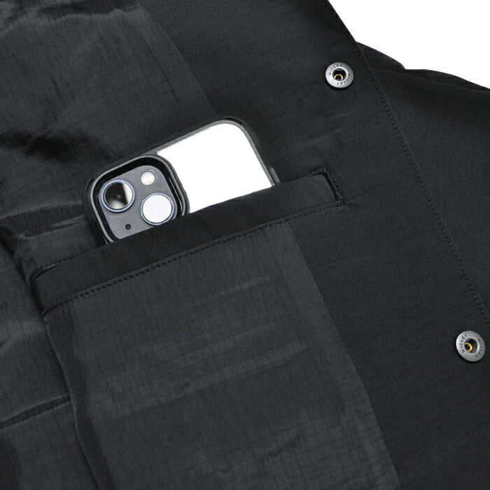 両腹部にはドットボタン付きのスラッシュポケット、また左側には大型スマホもすっぽりと収まるインナーポケットが備わっています。