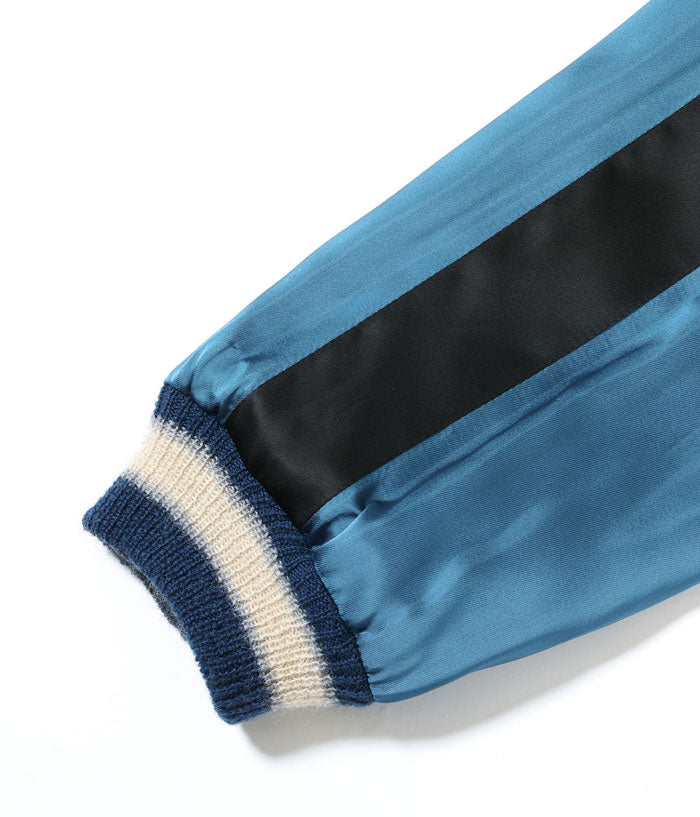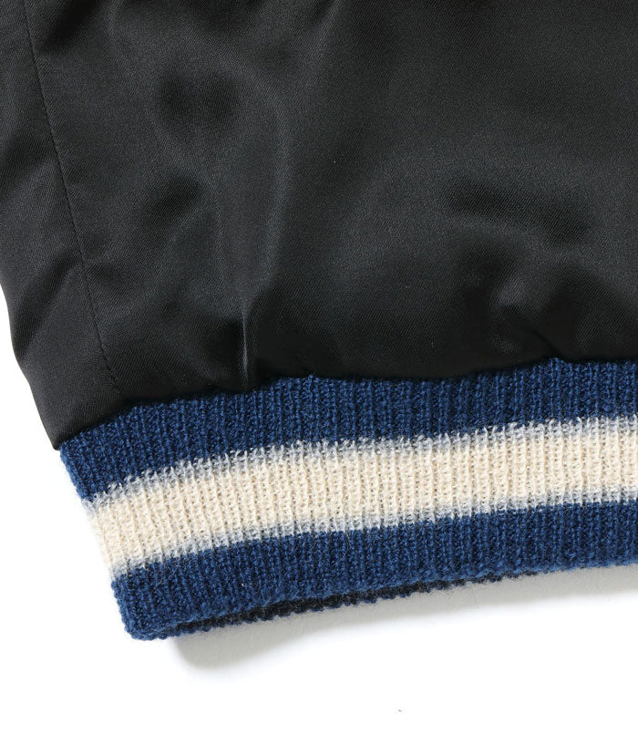 テーラー東洋のコレクションの中でも特に厳選した逸品をディテールにこだわり再現するのが、このスペシャルエディション。横振り刺繍で緻密に描かれた図案はもとより、アセテート生地の打ち込みを調整してヴィンテージと遜色なく仕上げ、ウールリブも旧式の横編み機を使用して1着ずつ編み上げている。リバーシブル仕様のファスナーについても50年以上前のファスニング機械を再稼働させ、当時と同じ手曲げのものを再現。テーラー東洋の前身である港商(こうしょう)商会のラベルを使い、ヴィンテージスカジャンの最盛期を彷彿とさせる仕上がりとなっている。