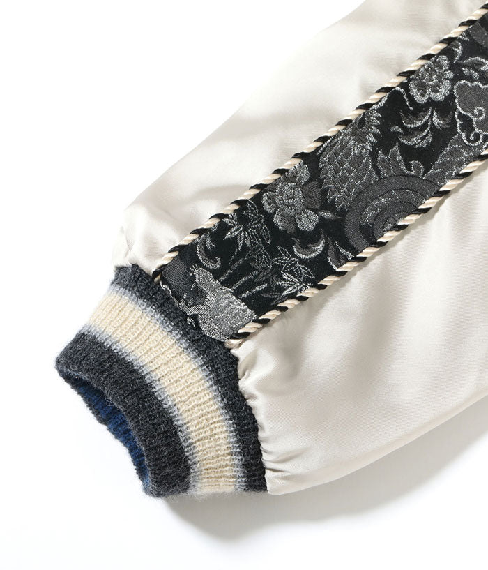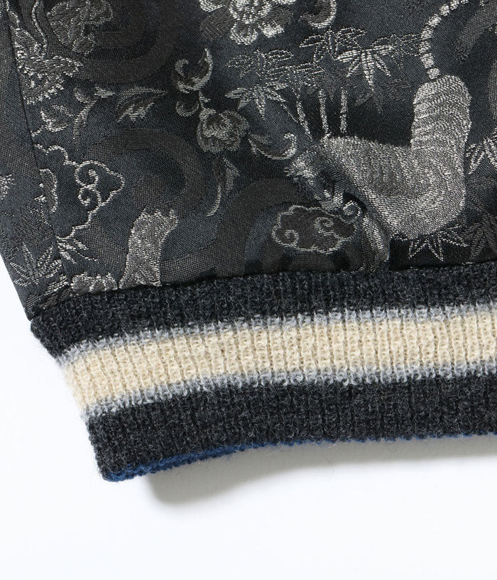 東洋エンタープライズの60周年を記念したもうひとつのスペシャルエディションが、この「ブロケード」のスーベニアジャケット。数あるヴィンテージスカジャンのなかでも極めて希少な、刺繍ではなく「織り」で絵柄が表現された作品である。ブラックのボディに輝くシルバーの糸で描かれているのは日本古来のモチーフである笹と虎、そして雷雲と龍。1950年代初期ごろ、スカジャンのバリエーションのひとつとして、群馬県の桐生や山梨県富士吉田の郡内など関東の歴史ある織物の産地で織られたブロケード生地が用いられていた。スーパーレアとされる髑髏柄やハンドプリントよりもさらに珍しい、ウルトラレアなコレクター垂涎の一着である。