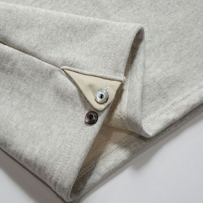 「もし1920年代にスウェットシャツのようなカットソーが存在したなら」と言う仮説により企画製造したモデルです。エリ元に重点を置く男性ファッションの風潮を反映したエリ・前立てスタイルと、1枚着でも見せられる杢オートミール素材と創り込み、着こなしによる変わるフィット感を調整する目的で付けられたサイド調整フラップなど、ありそうで無かった仕様が面白い1着です。