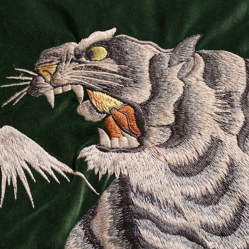 デラックスウエア初となるスーベニアジャケット(スカジャン)。刺繍機を用いて8か所に刺繍を施し、まるで職人が横振り刺繍で仕上げたような品質に迫った1着。本物の素材や刺繍糸の使用はもちろんのこと、刺繍部分を手で触り、生地素材と同等の柔らかさがあることがデラックスウエア品質の条件です。生地素材と共に刺繍も経年変化する本物品質を目・手触り・着心地で確認下さい。