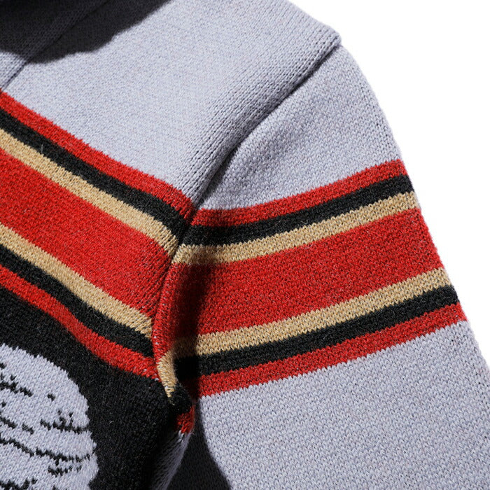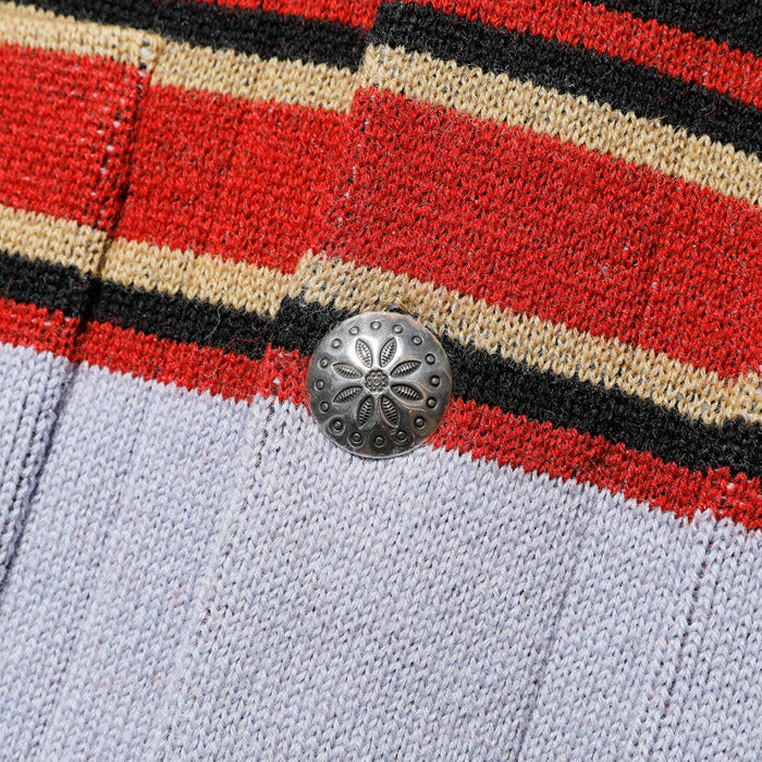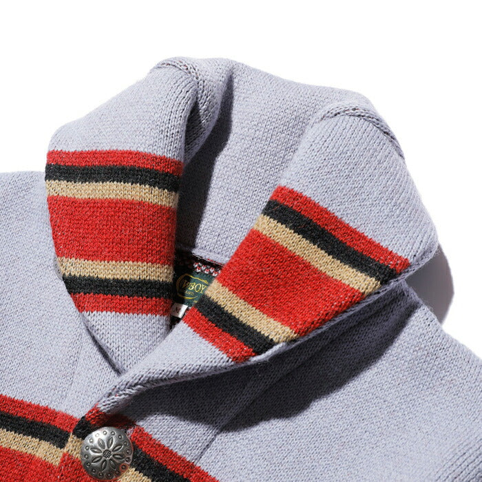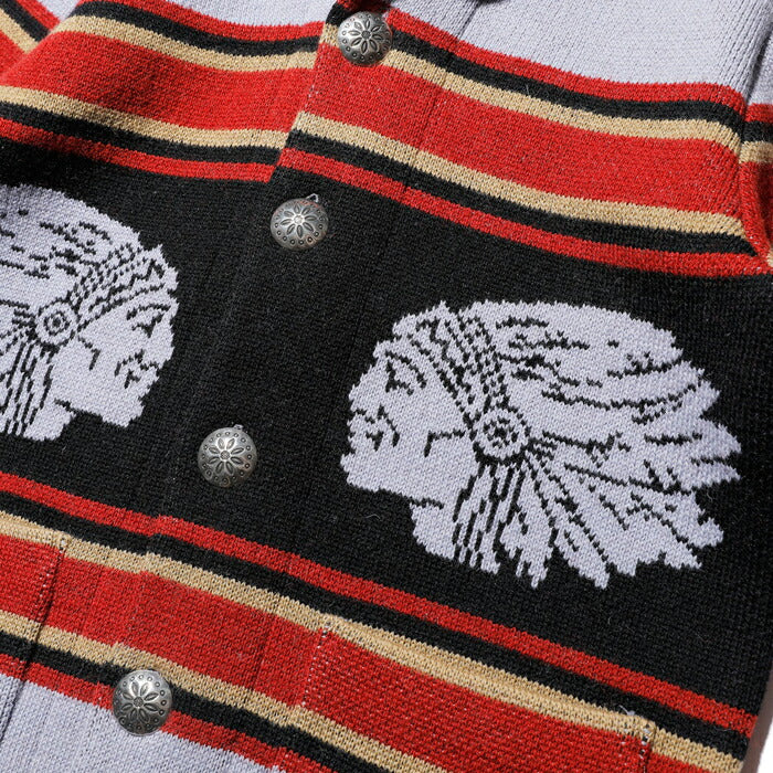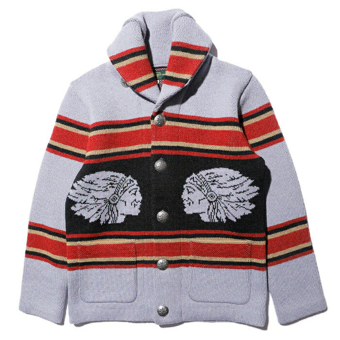 2025年のコレクションテーマは、「THE CREAM OF THE CACHE」。最上級のコレクションを意味する造語であり、一年を通じてJELADO秘蔵のヴィンテージアイテムを厳選し、再現していきます。 昨年大好評だった「ラグナ」を、今回は大胆にイメージを刷新。弊社所有のヴィンテージブランケットからサンプリングし、新たに編み立てました。 インディアンヘッドが描かれたブランケットの配色を基調にしながらも、カーディガンとしてのバランスを考慮。ネイティブアメリカンのエッセンスを活かしたデザインに仕上げています。 素材には、4本撚りのメリノウール糸を使用し、5ゲージのヘビーな編み立てを採用。しっかりとした肉厚な仕上がりで、保温性と存在感を両立しています。 また、フロントだけでなく背面にもインディアンヘッドの大胆なモチーフを配置し、個性的なアクセントを演出。 ネイティブ調のメタルボタンには、Made in USAのBLACK HAWK社製コンチョボタンを採用し、さらなる雰囲気をプラス。 高品質な糸で丁寧に編み上げられており、肌触りも抜群です。 デニムやチノ、ミリタリートラウザーなど、さまざまなスタイルにマッチする万能な一着。 ヴィンテージの魅力を取り入れた、JELADOならではのこだわりの一枚をぜひご堪能ください。