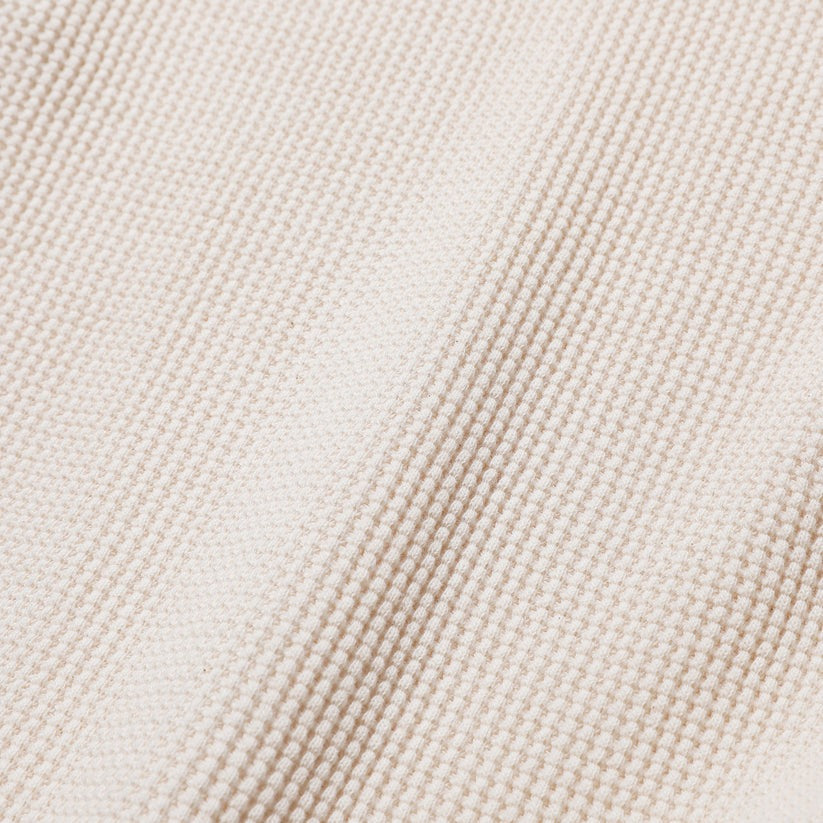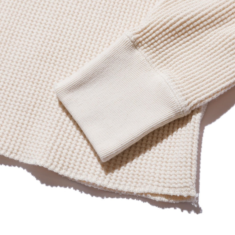 定番の"JELADO ATHLETIC BRAND" 10/- クルーネック MEGAサーマルTシャツに、新たにレギュラーフィットが登場。バニラとブラックの2色展開となります。従来のMEGAサーマルはインナーとしての要素が強く、タイトフィットな作りでしたが、レギュラーフィットはL/S TEEのパターンを採用し、一枚でも着やすいシルエットになっています。 一般的なヘビーサーマルに使用される30番手糸を超える10番手糸を採用し、大きくはっきりとしたワッフルの凹凸が特徴。空気の層を生み出し、優れた保温性を発揮します。洗濯を重ねてもふんわり感が続き、体にフィットしながらもストレスフリーな着心地を提供。横から見た際に余分な生地が出ず、重ね着時ももたつかない設計で、一枚で着てもスタイリッシュなバランスに仕上げました。 3本針縫製と強靭なリブを採用し、耐久性を向上。適度な締め付け感で快適な着心地を実現しています。優れた保温性とシンプルなデザイン、オールド感のある素材感が魅力のMEGAサーマルは、インナーとしても、一枚での着用でもスタイルが決まる万能な一着。冬のワードローブにぜひ加えてみてください。