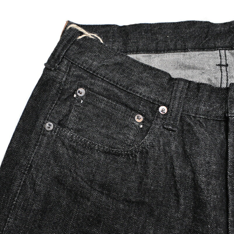 その汎用性の高さから近年益々需要が高くなってきたブラックジーンズはフルカウント定番商品である1101シルエットを採用しました。インディゴ染めと比較してゆっくりとした経年変化ではありますが、ロープ染色されたブラックは徐々にタテ落ちも楽しんでいただくことが出来ます。ゆっくりと織り上げた13.7ozのセルビッチデニムは定番デニム同様力織機ならではの耐久性と穿き心地を体験していただけます。