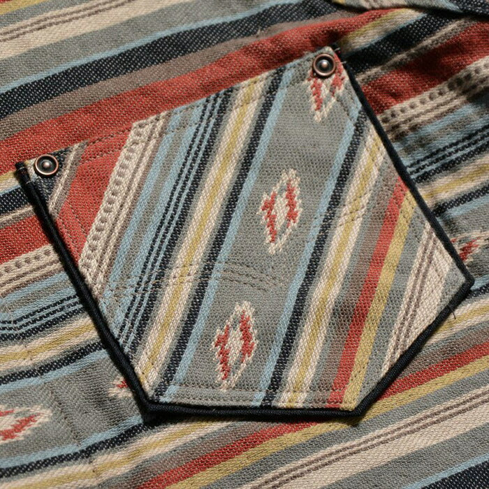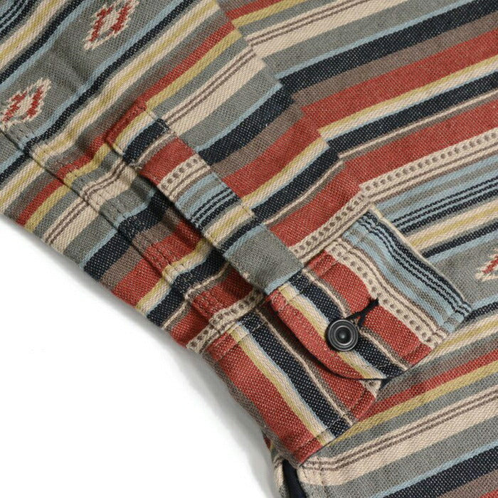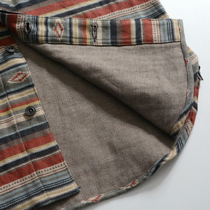 兵庫県西脇市で製造した3重織りヘビーネル素材。経糸に20/1糸、緯糸に20/2糸により構成し、ベースは2重織、ネイティブ柄部分は多色の色が重なるため3重織の組織で表現。肉厚の生地ながら柔らかな風合いが特徴。