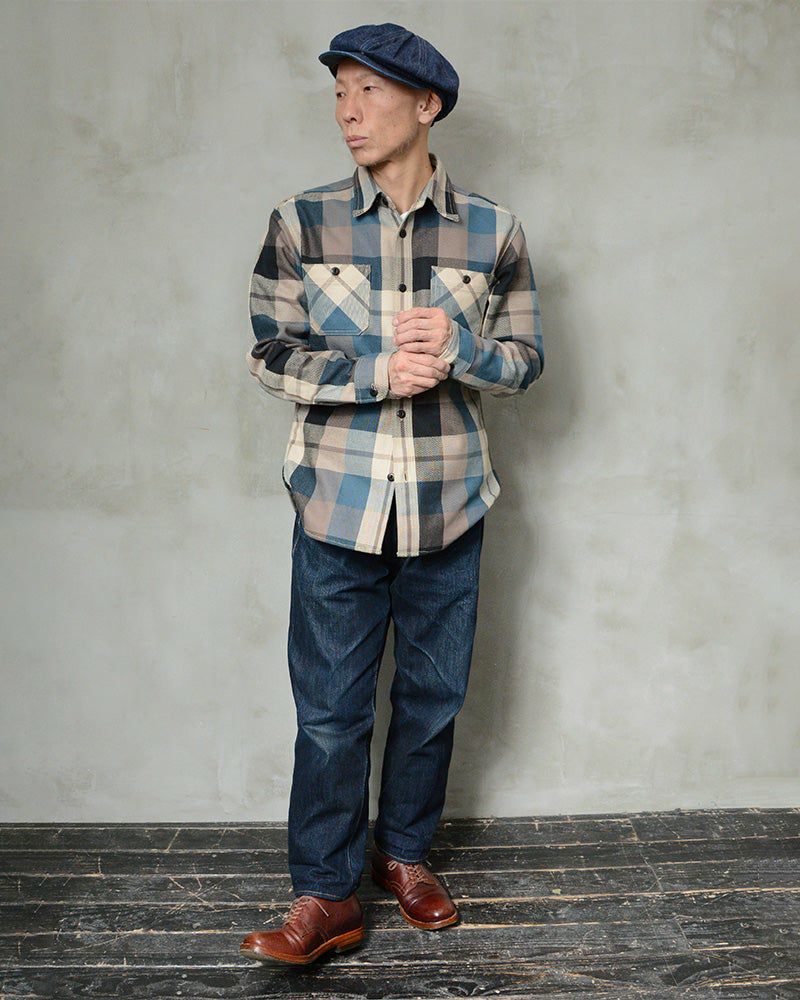 兵庫県西脇市で製造した太い織り糸によるマルチチェックのヘビーネル素材。かなりの綿量を使用することからコットンメルトンと呼ぶ極厚素材は重さにして13ozもある。