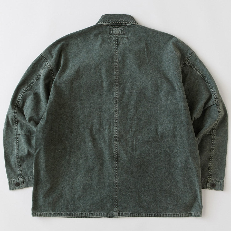 絶妙な色合いとアタリ感が印象的なケミカル加工を施したミリタリーシャツ。フラップ付きのボックスポケットやボタンフライのフロントなどオリジナルディテールを踏襲しつつも、身幅・肩幅にゆとりをもたせたBIGシルエットにすることで、スウェットをインナーに合わせたアウターライクなコーディネートで楽しみたいアイテム。フロントのブランドネームもさり気なく主張してくれる。