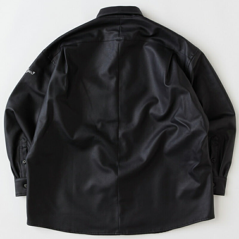 絶妙なムラ感のあるマットな合皮素材を使用したBIGシルエットシャツ。センターバックを切替えた独特な仕様で、ルーズになりすぎないレングスや袖まわりはボリュームのあるボトムスを合わせていつもとは違うカジュアルスタイルを楽しみたい。インナーにパーカーをあわせてアウターライクなコーディネートも面白い。袖のロゴ刺繍や裾のネームも程よいアクセントに。