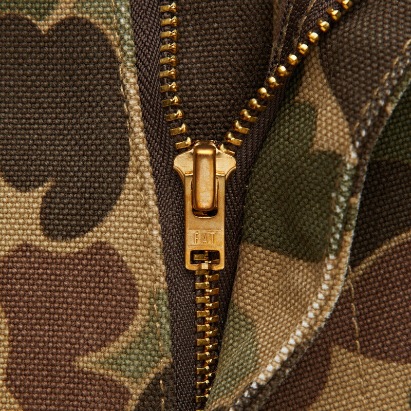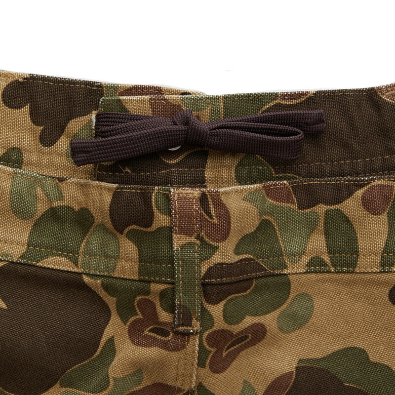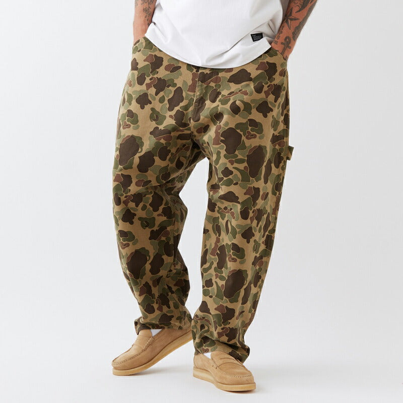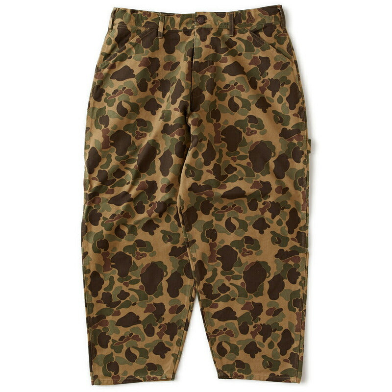 目の詰まった肉厚キャンバス素材を使用したペインターパンツはダックハンタープリントが印象的。ヒップから膝にかけてボリュームを持たせたワイドシルエットに加え、ジャストレングスはどんなスニーカーとも絶妙なバランスで合わせられる。ウォッシュ加工を施すことで適度な柔らかさと動きやすさに仕上げたアイテム。ドローコードを備え、ベルトレスでイージーパンツとして着用可能。バックポケットのブランドネームがさり気なく主張してくれる。