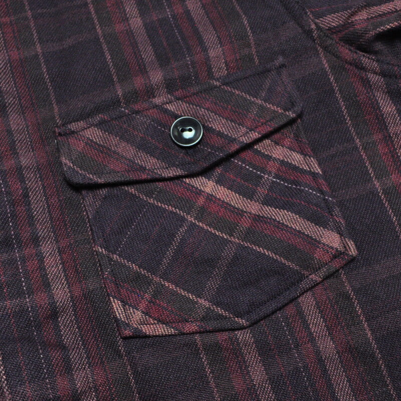 兵庫県西脇市で製造したヘビーネル素材。経緯糸共に空気紡績糸10番双糸のしっかり絞まった糸質を使用し、微弱テンションで織り上げたヘビーネル素材。しっかりした素材感と柔軟な着心地が楽しめる。