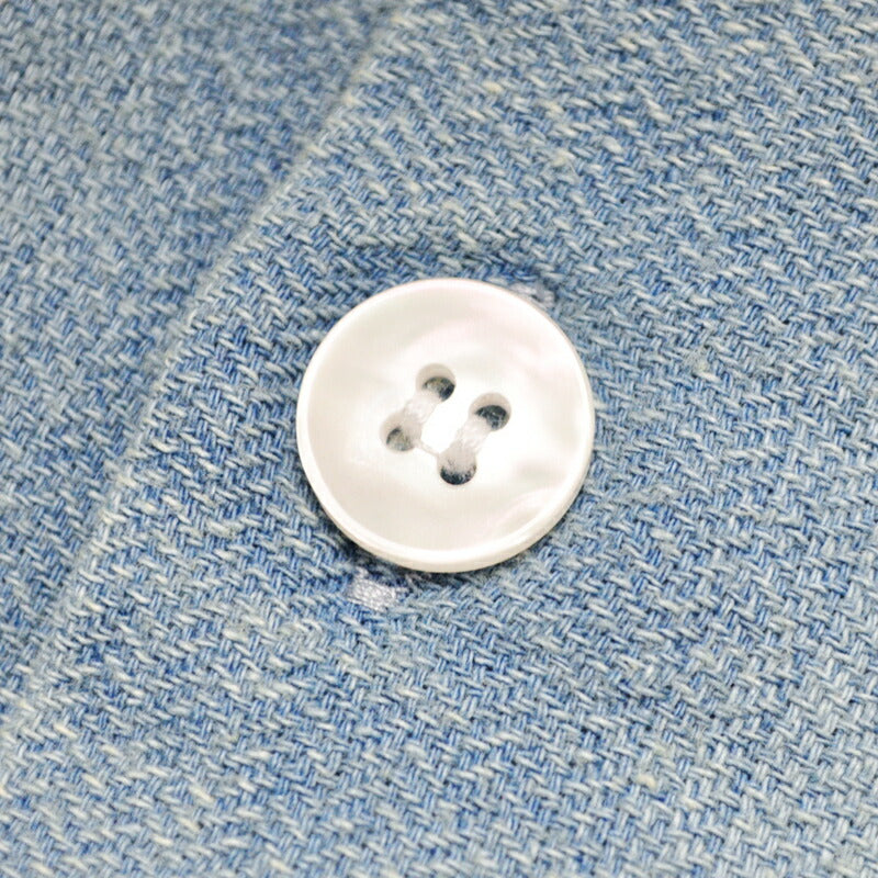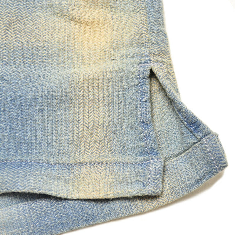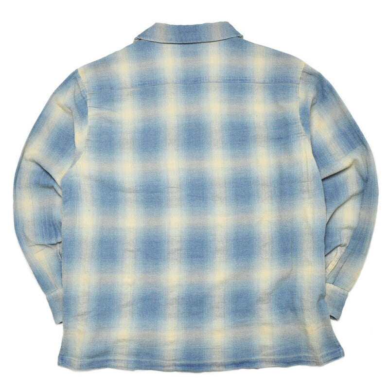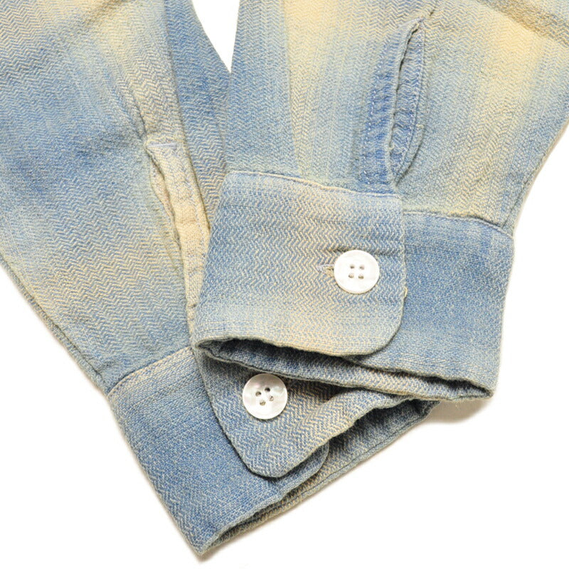 インディゴヘリンボーンオンブレーチェックを使用した、オープンカラーの長袖シャツ。市場ではあまり見かけることの無い珍しい生地で、織り方の特徴から耐久性や柔軟性にも優れており、しわが付きにくいのもメリット。 ブリーチ+ オーバーダイをミックスした、涼しげもありヴィンテージ感漂う色味もGOOD。