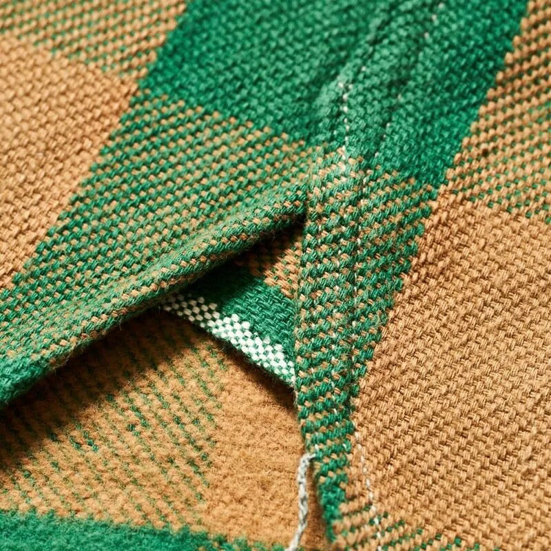 ウエアハウスのネルシャツは、生地に日本では限られた地域にしか残っていない力織機を使用して生地を作っています。フランネルの生地を作るために力織機を使う理由は単なる「耳付きのネル生地」を作りたいという理由からではありません、あくまでもセルビッチは副産物なのです。その目的は、力織機を使用することでムラ糸の持つ風合いを損なうことなく、生地に仕上げることができるからです。デニムと同じで、ヴィンテージネルシャツの生地を織っていた糸は不均一なムラ糸であった時代です。その糸を革新織機で強いテンションをかけて織ると違う生地になってしまう。せっかくの糸本来の性質が損なわれてしまうのです。旧式の力織機で織る事で、糸本来が持つ凹凸を損なうことなく生地を織ることが出来ます。ネルシャツを織る力織機はデニムと同じ綾織りの織機です。ネルシャツは柄を構成する必要があるため、多色の糸を織れる仕組みになっています。タテ糸は柄に合わせて複雑に上下移動し、その間を違う色のヨコ糸を持ったシャトルが次々に入れ替わり往復に移動します。こうして力織機らしい適度なテンションで織られたフランネルは、それぞれの糸本来が持っているムラを損なうことなく生地となるのです。生地になったネル生地は、当時の製法に倣って生地の裏に起毛加工を施しています。起毛をかけることで柄に柔らかい表情が生まれます。さらに起毛をかけることで生地に膨らみを生み、力織機ならではの肌触りをさらに柔らかなものに昇華させることができます。このように、力織機で織られたネルは、糸そのものから再現することでこそ生まれる風合いを持っています。それを見分ける最も簡潔な方法がセルビッチ(耳)の有無であり、1960年代頃までのヴィンテージネルシャツと同じように、ウエアハウスでもマチ部分にセルビッチを使用しているのです。