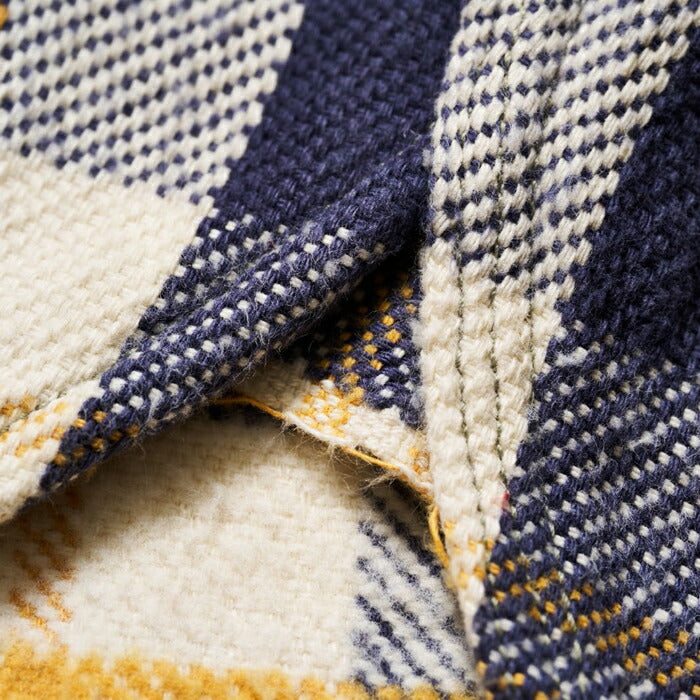 ウエアハウスのネルシャツは、生地に日本では限られた地域にしか残っていない力織機を使用して生地を作っています。フランネルの生地を作るために力織機を使う理由は単なる「耳付きのネル生地」を作りたいという理由からではありません、あくまでもセルビッチは副産物なのです。その目的は、力織機を使用することでムラ糸の持つ風合いを損なうことなく、生地に仕上げることができるからです。デニムと同じで、ヴィンテージネルシャツの生地を織っていた糸は不均一なムラ糸であった時代です。その糸を革新織機で強いテンションをかけて織ると違う生地になってしまう。せっかくの糸本来の性質が損なわれてしまうのです。旧式の力織機で織る事で、糸本来が持つ凹凸を損なうことなく生地を織ることが出来ます。ネルシャツを織る力織機はデニムと同じ綾織りの織機です。ネルシャツは柄を構成する必要があるため、多色の糸を織れる仕組みになっています。タテ糸は柄に合わせて複雑に上下移動し、その間を違う色のヨコ糸を持ったシャトルが次々に入れ替わり往復に移動します。こうして力織機らしい適度なテンションで織られたフランネルは、それぞれの糸本来が持っているムラを損なうことなく生地となるのです。生地になったネル生地は、当時の製法に倣って生地の裏に起毛加工を施しています。起毛をかけることで柄に柔らかい表情が生まれます。さらに起毛をかけることで生地に膨らみを生み、力織機ならではの肌触りをさらに柔らかなものに昇華させることができます。このように、力織機で織られたネルは、糸そのものから再現することでこそ生まれる風合いを持っています。それを見分ける最も簡潔な方法がセルビッチ(耳)の有無であり、1960年代頃までのヴィンテージネルシャツと同じように、ウエアハウスでもマチ部分にセルビッチを使用しているのです。