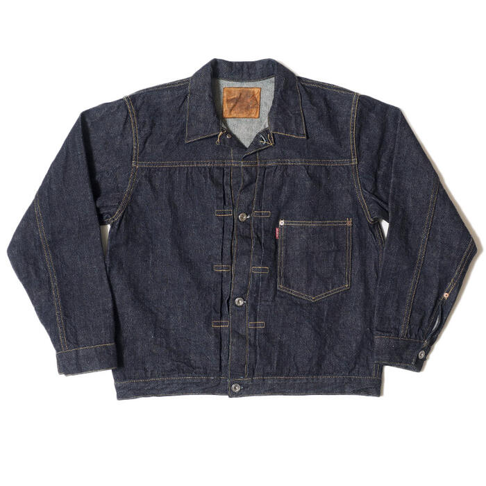デニムはWW2のデッドストックのデニム生地のたて、よこの番手、染めの堅牢度なども徹底的に解析して新しく作成したもので、ウエアハウスのバナーデニム「13.5オンス」とくらべてやや厚手になっています。またピスネームは上下に白が入る、大戦時に実在したイレギュラーなものを再現しました。縫製仕様も徹底的に再現しています。下前のステッチの省略、プリーツ止めの幅、縫い返し(ピスネーム側は上で縫い返し逆側は下で縫い返しています。襟の縫い手順や糸の始末(縫い流し)もそのままに、デッドストックを水通ししたような風合いを再現しています。